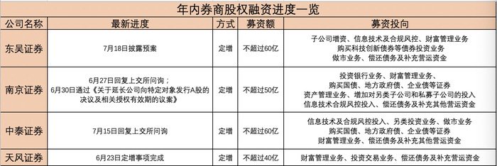 随着东吴证券(601555.SH)抛出60亿元定增预案,证券行业年内首个非并购重组配套募资的定增预案出炉。包括东吴证券在内,年内还有4家券商再融资事项正在推进中。