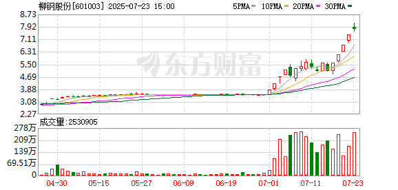 7月23日,柳钢股份(601003)发布公告,公司股票在7月21日、22日和23日连续3个交易日,收盘价格涨幅偏离值累计超过20%。